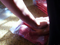 I date a quart freezer bag and put about a pound of the meat in. Then, seal the bag 3/4 of the way.