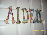 - I painted the edges and modge podged scrapbook paper onto these letters to spell his name. Then, I embellished them with buttons. I attached them to the door with glue dots.