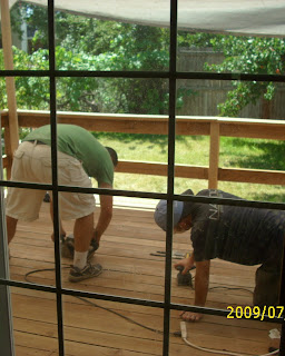 5. Now come in with the electric sanders/belt sanders to do the touch ups and remove any extra paint. We were really picky and sanded pretty much the entire deck so the wood would be really smooth and nice to put the stain on. Once again, check the weather! We did the following steps on a 104 degree day. Not so smart.