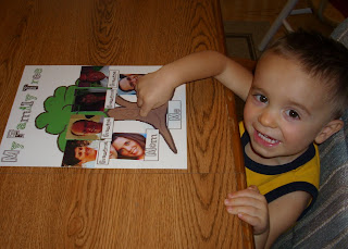 I love the idea of a family tree and helping him to know that his Papas and Grandmas are Mommy and Daddy’s Moms and Dads. I made him a little family tree file folder game by altering the basic family tree found on Kid’s Turn Central.
