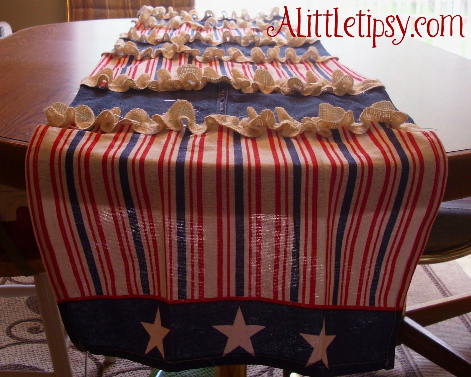 This is a fun patriotic table runner with a little burlap ruffle for added cuteness. I made it for the 4th of July, but it can easily be done with alternate fabric for any occasion.