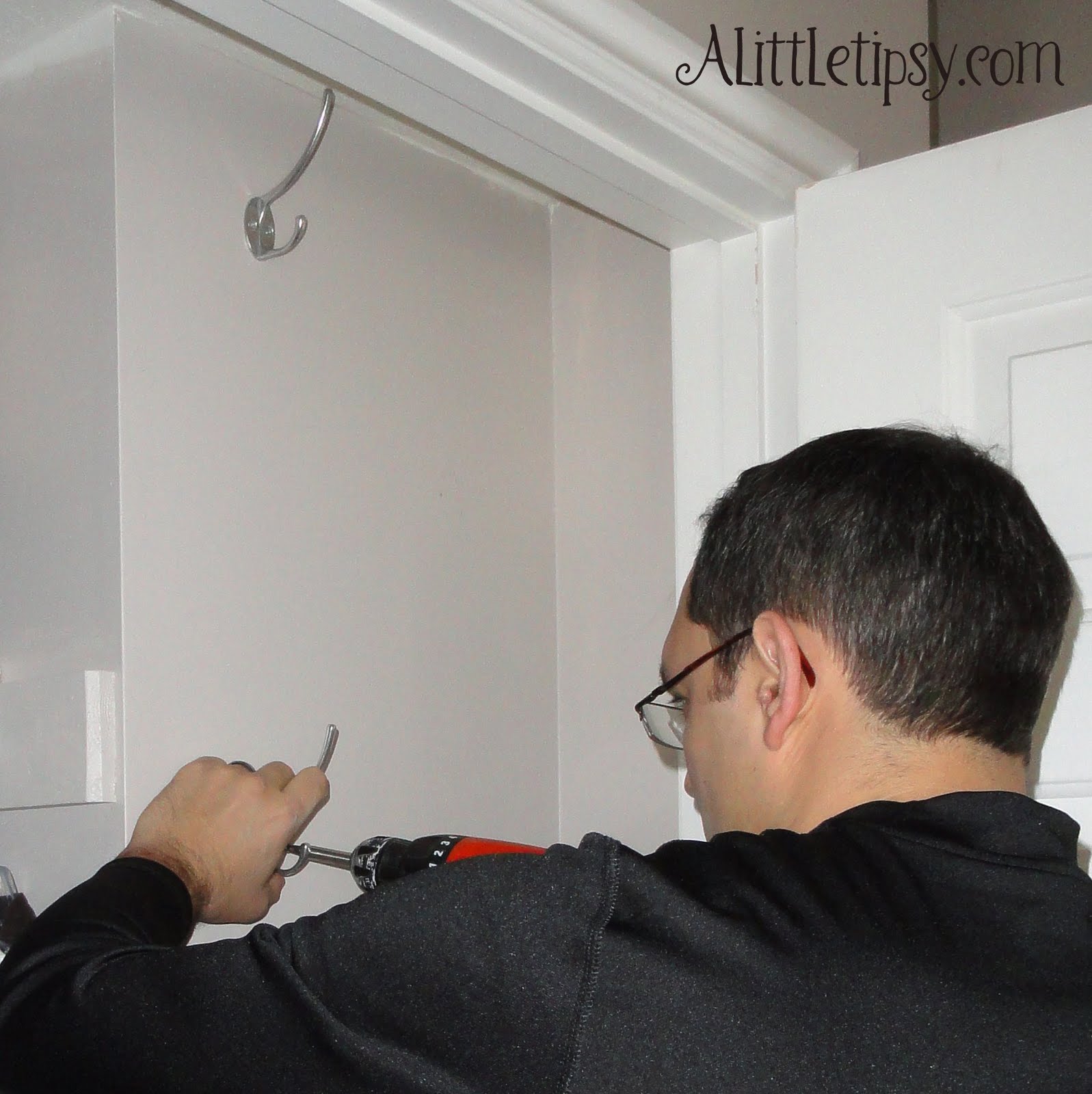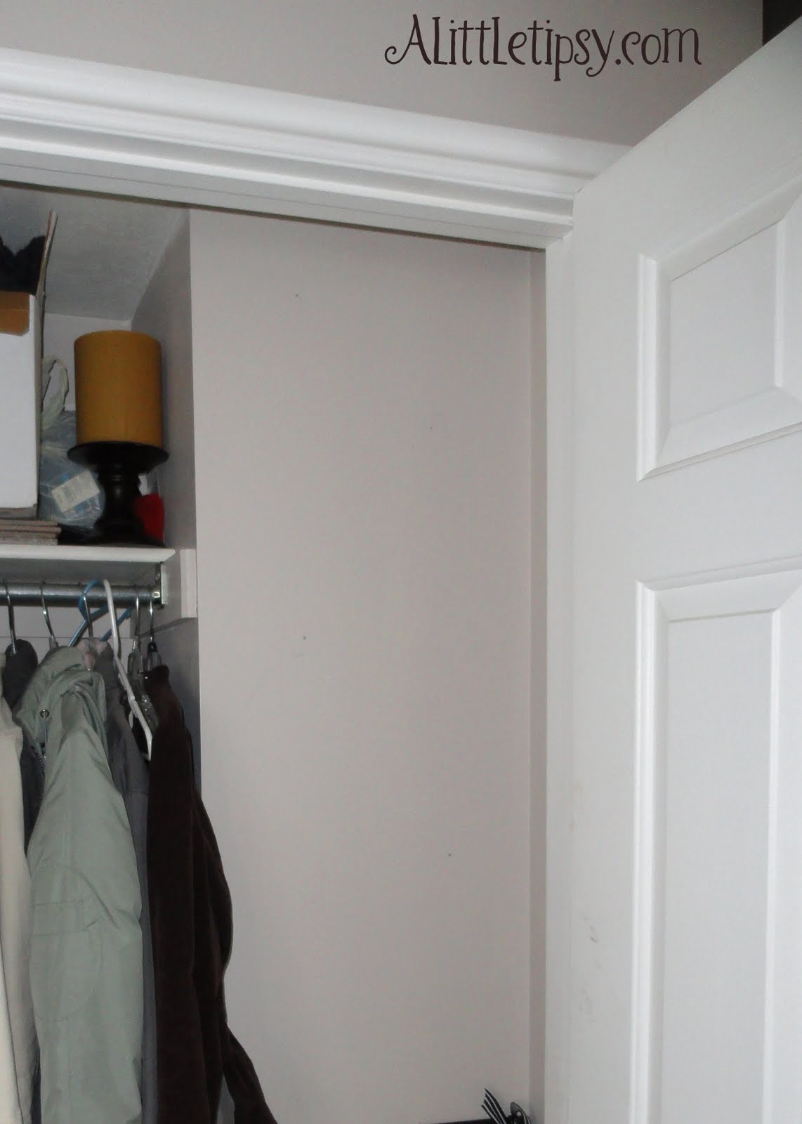 I had a bunch of bags sitting around since I am back on diaper bag duty. I hated having them in piles and needed another option. Lucky for me I have a totally odd space in my coat closet that was such a wasted space. I got some hooks, borrowed my handy husband and that was that. My bags are empty so they are light enough to hang straight in the drywall. If they were full, I would need to attach my hooks to studs.