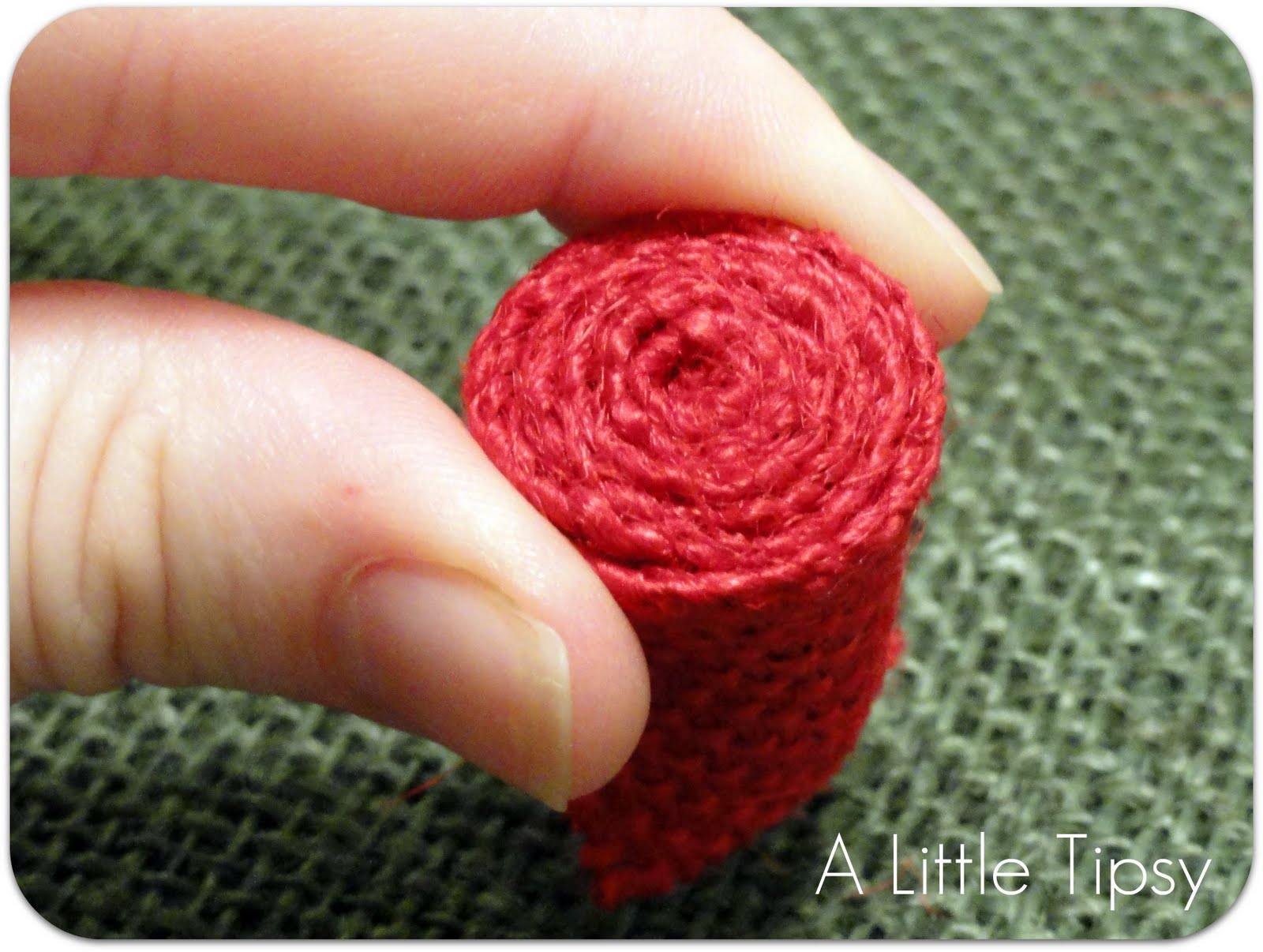 1. Take a 6 inch by 1 inch piece of red burlap and fold over one of the long edges. Roll the burlap keeping the folded edge out. Hot glue the end of the roll to secure and trim off excess from the bottom so it is about 1/2 inch thick.
