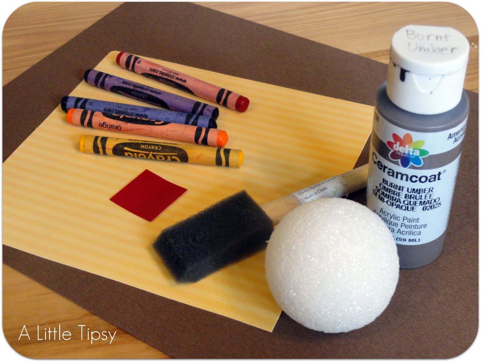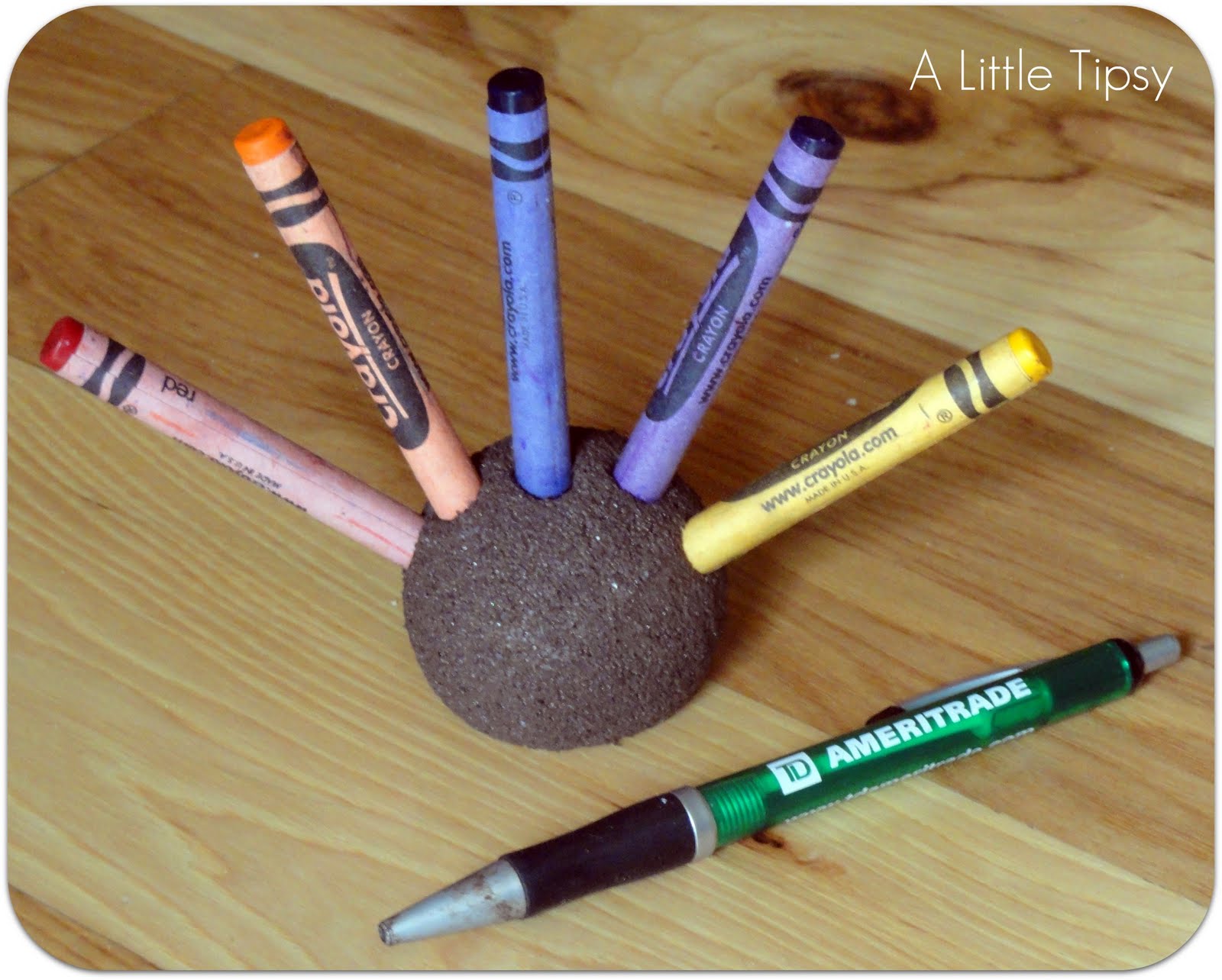 3. In the center of the ball, push the pen in to the styrofoam about 1/2 inch to make a holes for the crayons. It has to be in the middle straight to the center or the crayons will tip the ball over.
