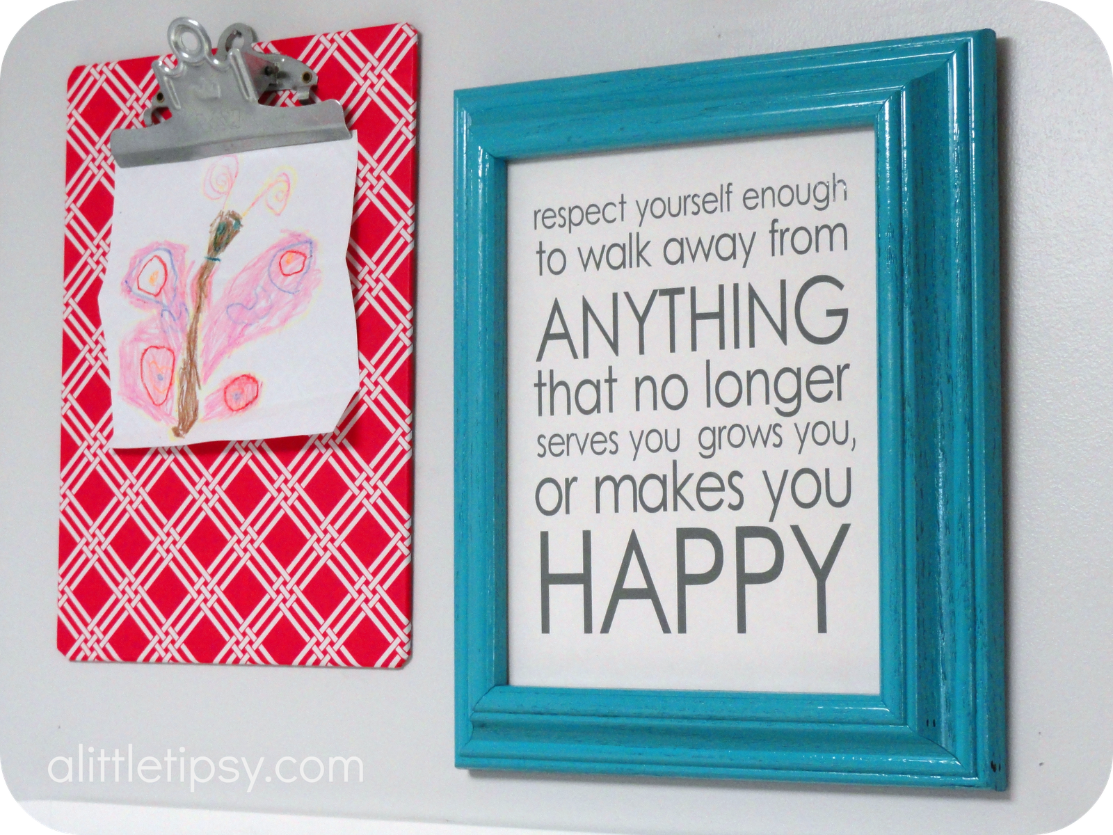 Picture frames are a great way to add pops of color without committing to a large expensive piece. I used three chunky frames in my new office/craft room to house quotes that I love.
