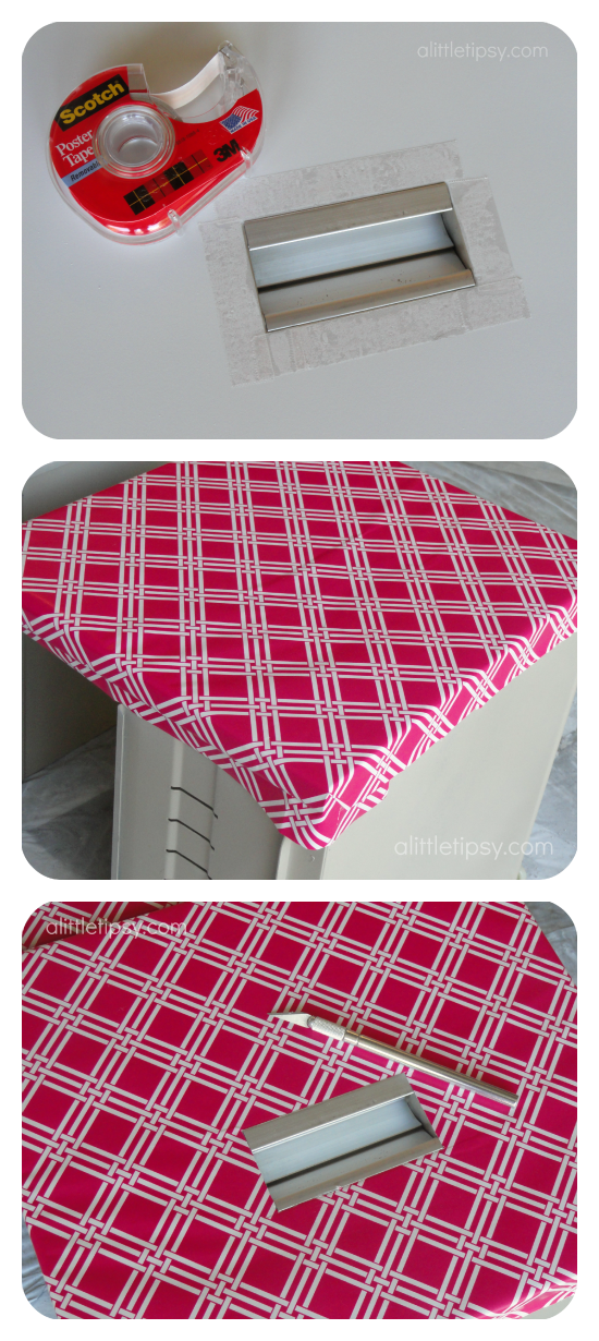 5. Tape around the edges of your handle. Tape around the edge of the front of the drawer and on all the lips around the edge to wrap the paper around.