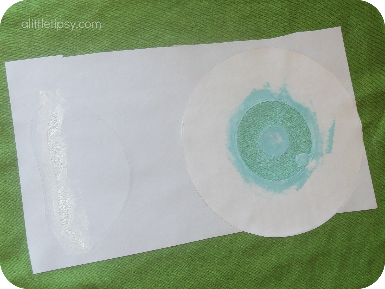 3. Using separate little bowls mix up black, white and green with the fabric medium according to package directions. Carefully paint by dabbing with the foam brush. Paint the mouth and the middle of the eye black. Paint the outer eye and little dot in the eye white. Paint the lip line green. Use as many coats as it takes to get the vibrancy you want. Let it dry completely.