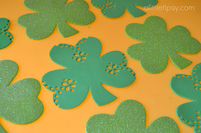 I got to work punching the edges of all the plain green shamrocks. I figured the glitter ones were enough on their own.