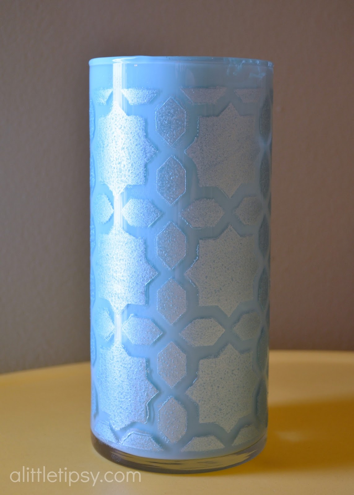 2. Spray the back of your stencil with spray adhesive so it will stick to your vase and help make the stencil lines crisper. Using your foam brush dob the pearl paint over the stencil. It may create little bubbles, but they will go away.