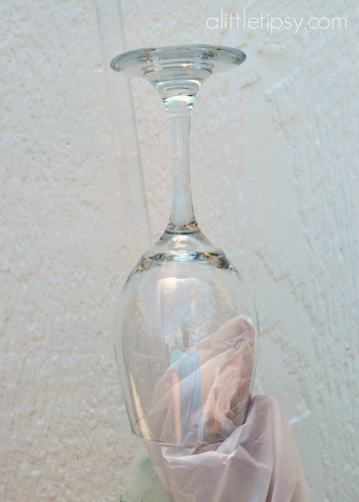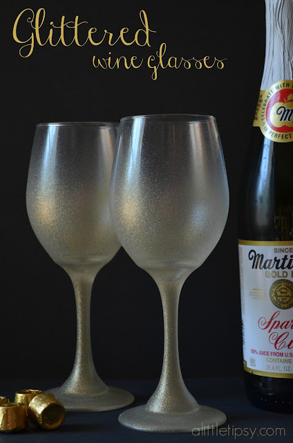 4. Paint the glasses with multiple light coats letting them dry between to avoid puddling. Do not tilt the sprayer more than 45 degrees. Continue glittering, more concentrated at the base and gradually becoming thinner at the top giving it an ombre effect. If the sprayer gets clogged, put your finger over the hole and press down the sprayer. This will clear out the tube. Dry completely.