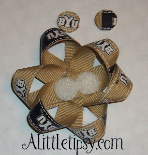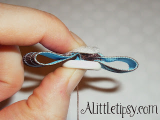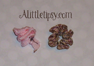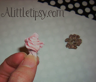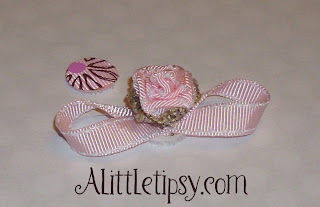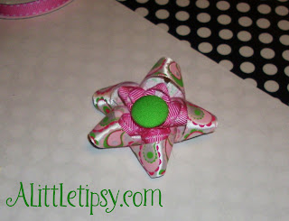 1. Get a small circle of ribbon. Squish the middle between your fingers and stitch. Then add your button on the front and your velcro on the back and stitch together.