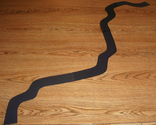 1. Start off by cutting the light string out of black paper. It can be any shape you like, just squiggle it around. I kept mine about 1.5 inches thick so it would be sturdy to lift once I got it all put together. I overlapped the edges about 1/2 inch and secured with tape.
