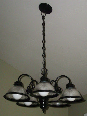 Here she is in all her glory. I have hated this ugly brassy light fixture in my kitchen since I moved in 4 years ago. I finally got around to fixing her up with a new outfit. I chose a sleek black, mostly because I could not find oil rubbed bronze spray paint. Anyone know where to get that stuff? Home Depot and Lowe’s do not carry it.