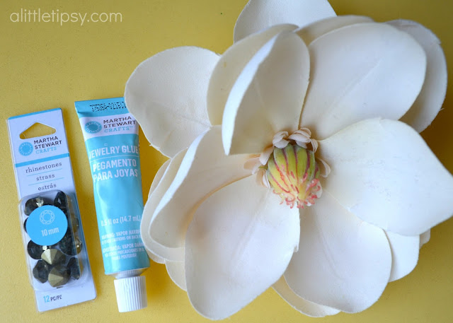 2. Glue the rhinestones in place. I used 7 rhinestones in something of a circular flower pattern. Let the glue dry overnight.
