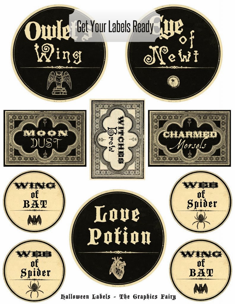There are many sites online where you can download Halloween labels for free. The labels above are from The Graphics Fairy, but a quick Pinterest search will yield other options as well. Download your labels and print them on adhesive backed paper. If you don’t have adhesive backed paper, double-sided tape works too. Cut each label out, and position onto your bottles.