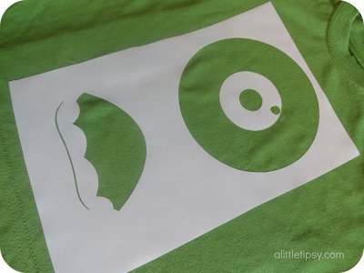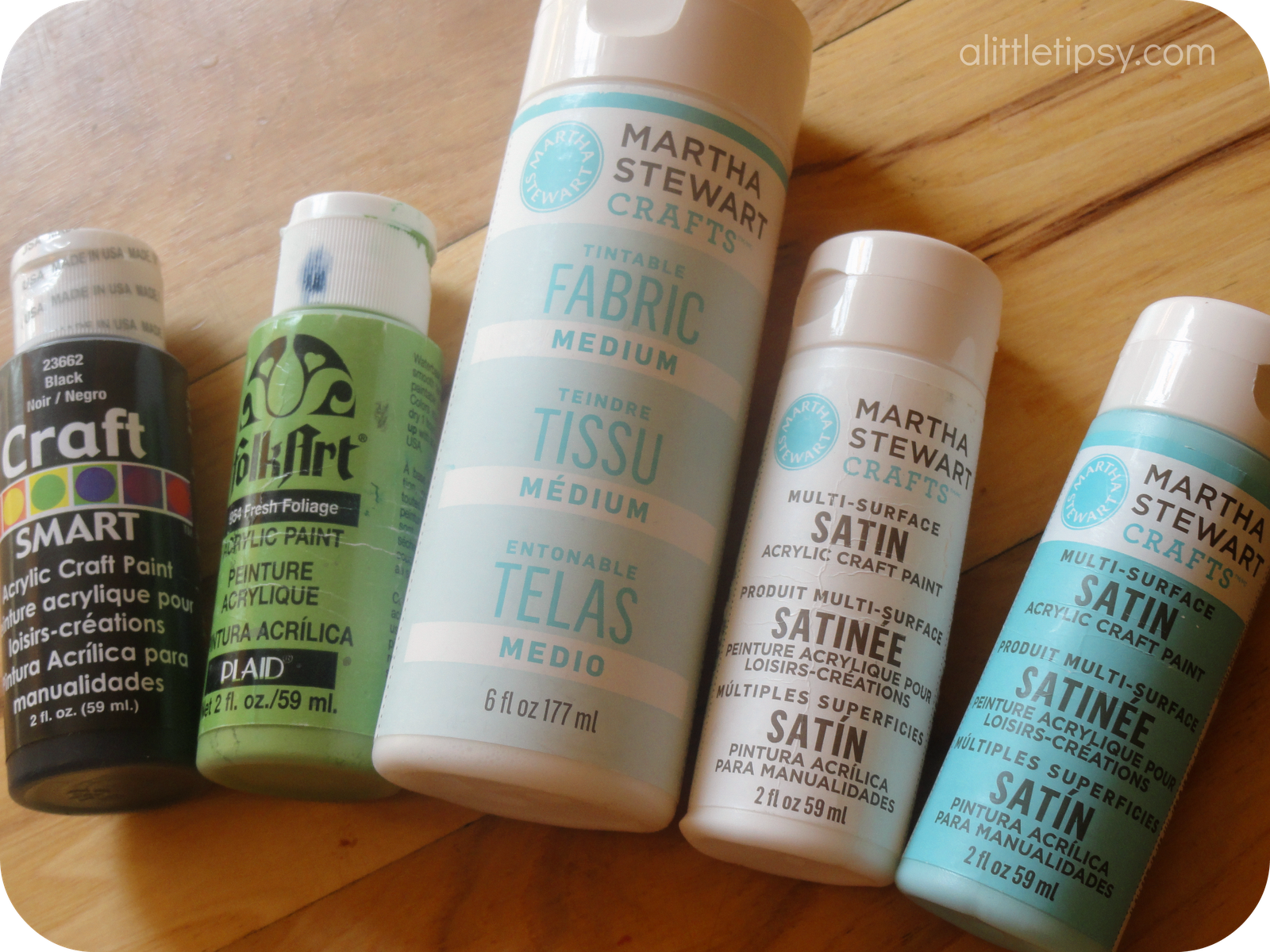 3. Using separate little bowls mix up black, white and green with the fabric medium according to package directions. Carefully paint by dabbing with the foam brush. Paint the mouth and the middle of the eye black. Paint the outer eye and little dot in the eye white. Paint the lip line green. Use as many coats as it takes to get the vibrancy you want. Let it dry completely.