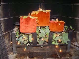 I found these corduroy pumpkins with cinnamon stick stems (so cute!) along with the vine and twinkle light adorned multi-candle stand at a garage sale. I stuck them in my fireplace since we never use it. I even cleaned it out with lysol wipes because my son kept sticking his hands in the ash residue. It looks extra festive at night with the lights on.