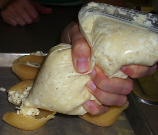 Snip one of the bottom corners off the bag and use like and icing bag to fill each shell with about 2 Tablespoons of filling. We had two people so I held the shells open while my sis filled, but it can be done with one as shown here.